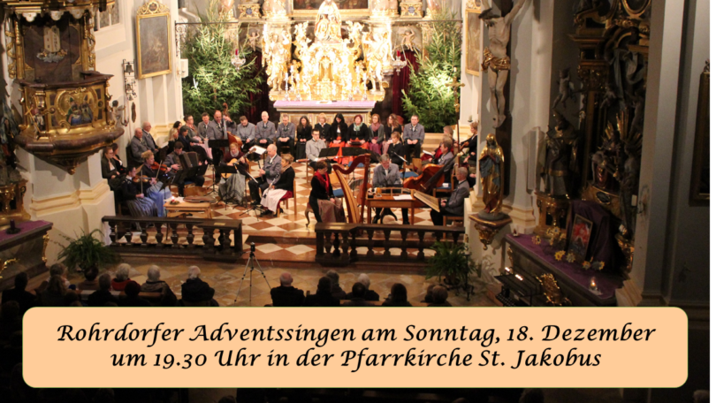 In diesem Jahr findet das traditionelle Rohrdorfer Adventssingen wieder am 4. Adventssonntag um 19.30 Uhr in der Pfarrkirche St. Jakobusstatt. Neben dem Chor des Liederkranzes unter der Leitung von Richard Haimmerer beteiligen sich verschiedene einheimische Musik- und Gesangsgruppen mit adventlichen Liedern und Weisen. Sprecher ist Jakob Opperer sen.