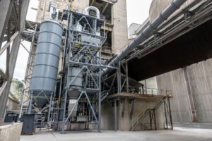 Vorderansicht der Anlage. Links im Bild das Silo mit dem Rohmaterial. In der Mitte die Zyklone und die Brennkammer. Rechts der Drehrohrofen und die Leitung für die Klinkerkühlerabluft.