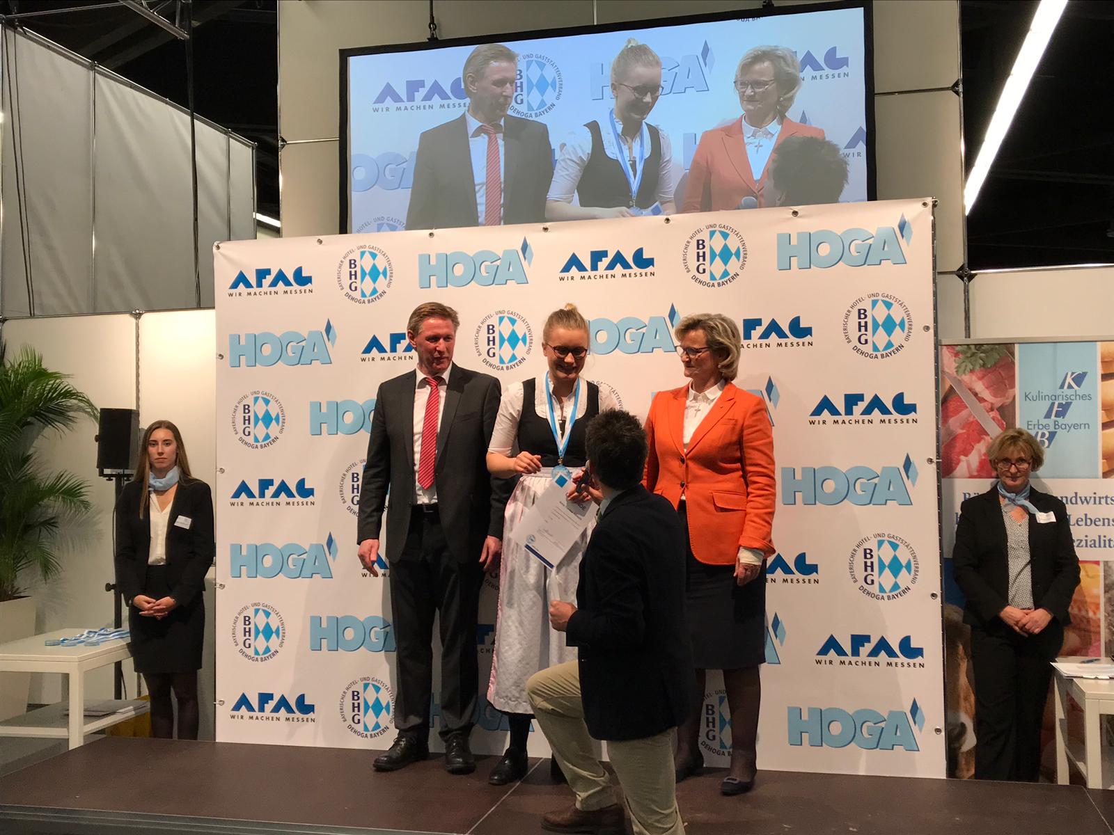 2. Platz – von links nach rechts: Hans Schneider, Vorsitzender der Berufsbildung des Dehoga Bayern, Anna Albrecht, Vizemeisterin bei den Hotelfachleuten, Angela Inselkammer, Präsidentin des Dehoga Bayern