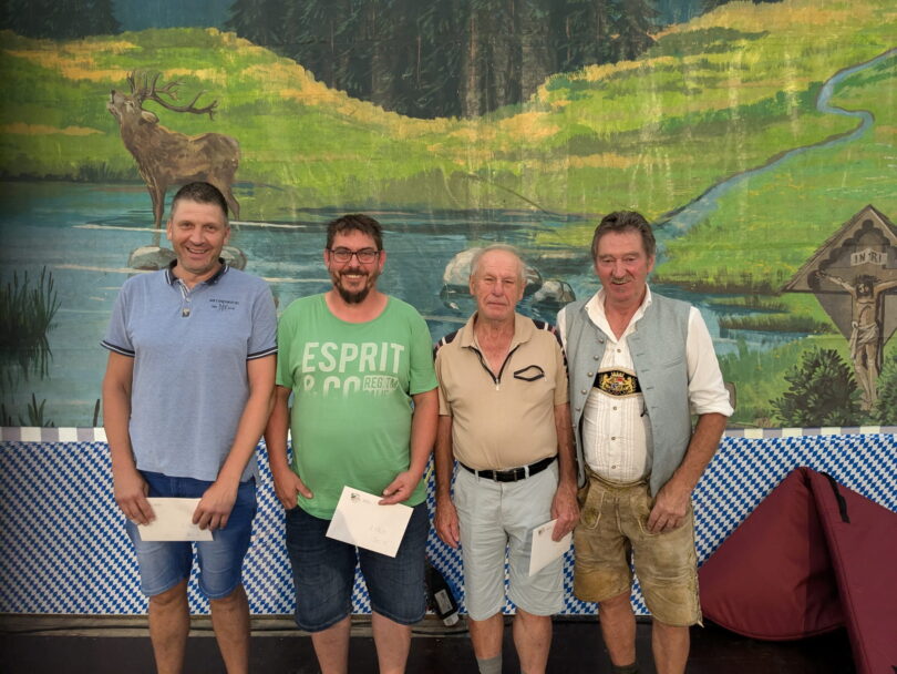 Foto: Siegerbild vom Aschauer Preisschafkopfen von links: Franz Steiner (3.), Tobias Raab (1.), Hans Rösch (2.) und Spielleiter Hans Winkler.