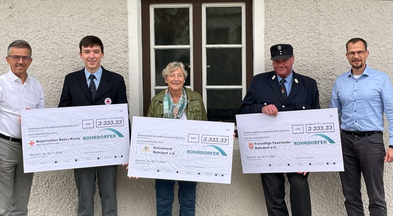 Das Rohrdorfer Zementwerk spendet 10.000 Euro an Vereine in Rohrdorf. Am vergangenen Donnerstag wurden die symbolischen Schecks an die Feuerwehr, das Bayerische Rote Kreuz sowie das Sozialwerk Rohrdorf überreicht. Die Spende erfolgt anlässlich des Tages der offenen Tür im Zementwerk Rohrdorf, bei dem Ende September rund 5.000 Euro durch den Verkauf von Speisen und Getränken zusammengekommen waren. Der Betrag wurde von Rohrdorfer verdoppelt und nun den Vereinen zu gleichen Teilen übergeben.