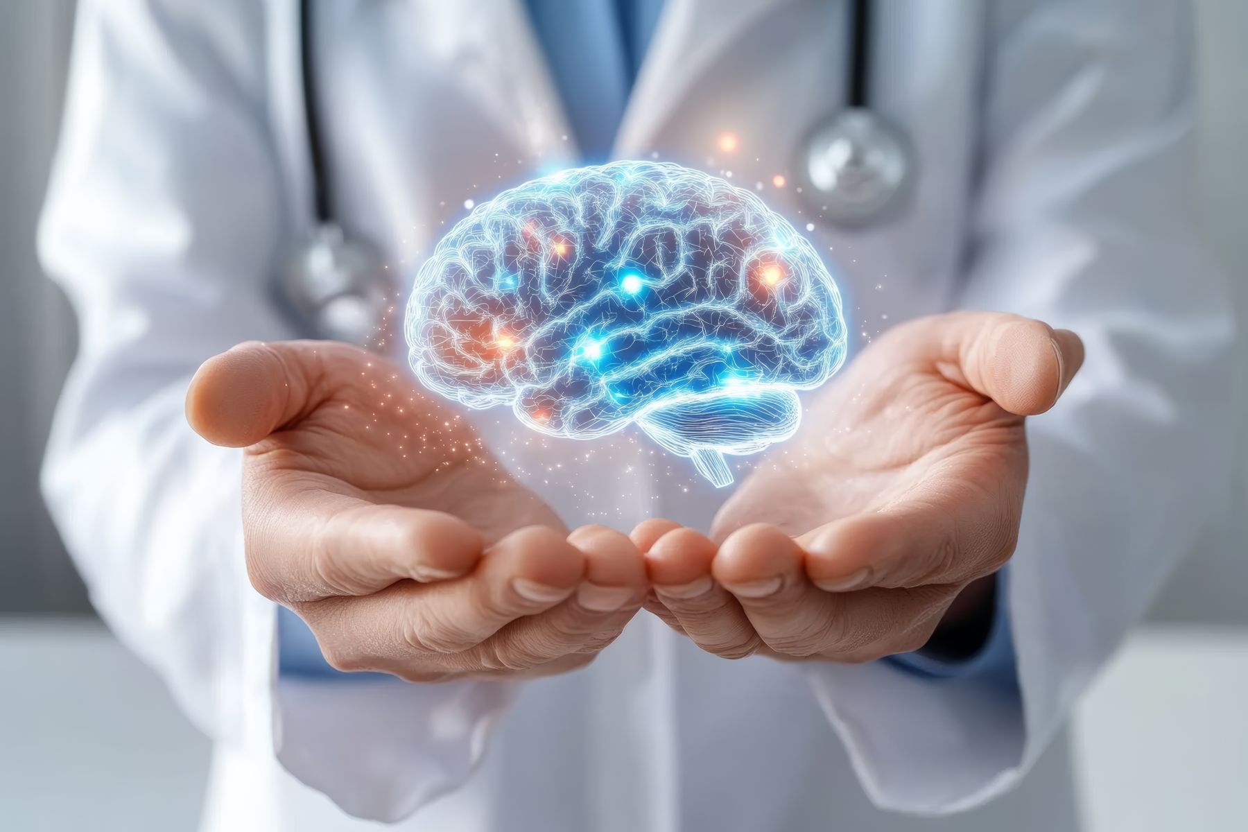 Doctor Holding Glowing Brain Hologram in Lab Coat for Mental Illness and Neurology Diagnosis Concept