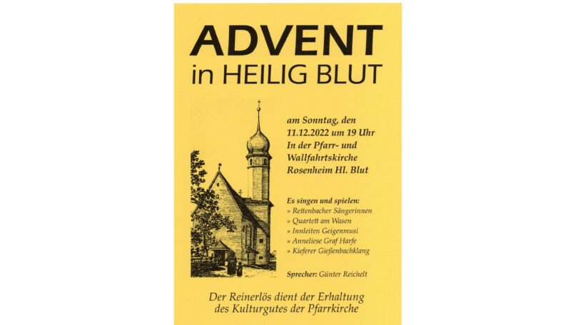 „Advent in Heilig Blut“, unter diesem Titel findet am Sonntag, den 11. Dezember 2022 um 19.00 Uhr das schon zur Tradition gewordene und über die Stadtgrenzen hinaus bekannte Adventsingen in der Pfarr- und Wallfahrtskirche Rosenheim Heilig Blut statt.