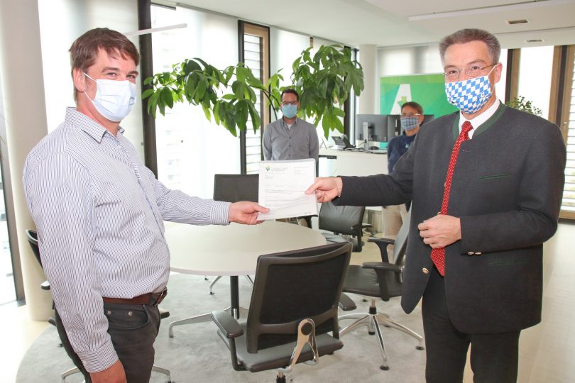 Bericht und Foto: Landratsamt Rosenheim – Eine Überlastung der Krankenhäuser zu verhindern ist Aufgabe des neuen Ärztlichen Leiters Krankenhauskoordination Dr. Michael Städtler. Landrat Otto Lederer überreichte ihm das Ernennungsschreiben. Im Hintergrund: Sachgebietsleiter Stefan Forstmeier und Abteilungsleiterin Bettina Bauer, zuständig für Öffentliche Sicherheit und Ordnung.