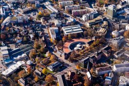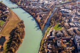 Noch ist die Inn- und Kreis-Stadt Rosenheim ohne weißes Winterkleid, so dass bei einem Flug über die Stadt viele Stadt-Merkmale besonders gut erkannt werden können – zum Beispiel der Mangfall-Kanal, wenn er in den Inn mündet oder deer Rosenheimer Lokschuppen, der sich gerade von oben in seiner eigenwilligen Architektur zeigt.