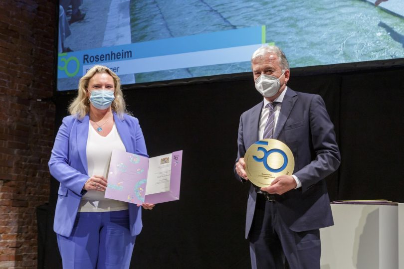 Rosenheim ist für die erfolgreiche Umsetzung von Maßnahmen der Städtebauförderung in den drei Fördergebieten Altstadt, Altstadt Ost und Bahnhofsareal ausgezeichnet worden. Im Rahmen der Festakts zu „50 Jahren Städtebauförderung“ haben Rosenheims Alt-Oberbürgermeisterin Gabriele Bauer und der ehemalige Baudezernent Helmut Cybulska aus den Händen von Staatsministerin Kerstin Schreyer den Preis in der Kategorie „Aktive Mitte und lebendige, attraktive Ortszentren“ erhalten.