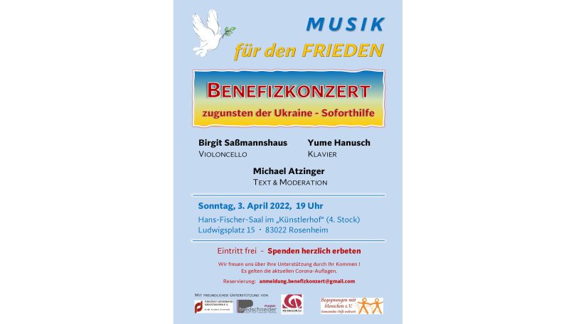 Mehrere Mitglieder des Berufsverbands „Tonkünstlerverband Südostbayern e.V.“ veranstalten Benefizkonzerte, deren Erlöse an die Ukrainehilfe geht. Das nächste Konzert hierzu findet am kommenden Sonntag, den 3. April 2022, um 19 Uhr im Hans-Fischer-Saal im “Künstlerhof” (4. Stock, Ludwigsplatz 15) in Rosenheim statt.