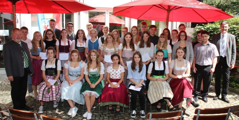 41 Schülerinnen und Schüler der Mittelschulen im Landkreis Rosenheim haben ihren Abschluss mit der Note 1,5 und besser geschafft. Der stellvertretende Landrat Josef Huber ehrte sie zusammen mit Markus Kinzelmann vom Staatlichen Schulamt im Garten des Landratsamtes Rosenheim.