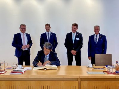 Verbunden mit dem Antrittsbesuch war der Eintrag von Nobutaka Maekawa ins Goldene Buch der Stadt. Oberbürgermeister Andreas März betonte die Bedeutung des Treffens: „Ungeachtet aller Corona bedingten Reisebeschränkungen lebt unsere Städtepartnerschaft. Die Beziehungen auf der Grundlage von Schüleraustausch und Delegationsbesuchen sind stärker als das Virus.“ Ein Schwerpunkt des Treffens war der Besuch im Gründerzentrum Stellwerk 18. Zweiter Bürgermeister Daniel Artmann und Geschäftsführer Richard Weißenbacher führten den Generalkonsul, Vizekonsulin Keiko Toda und Wirtschaftskonsul Tomoyuki Kishi sowie Hajime Takatsuka von der japanischen Außenhandelsgesellschaft JETRO durch das Gebäude. Gründer Patrick Burkhart präsentierte die ScaliRo GmbH als ein Beispiel der vielfältigen dort ansässigen Startups. Auch beim Rosenheimer Japan-Wirtschaftstag, der regelmäßig mit Unterstützung der Sparkasse Rosenheim-Bad Aibling durchgeführt wird, soll der Schwerpunkt künftig auf der wirtschaftlichen Zusammenarbeit der beiden Regionen liegen. „Unser Ziel ist es, Rosenheimer Start-ups mit den Startups der Region Ichikawa und der Präfektur Chiba – in direkter Nachbarschaft zu Tokyo – zusammenzubringen. Gerade in den Bereichen IT und neue Technologien gibt es in beiden Ländern sehr interessante Gründungen, die im Austausch voneinander profitieren könnten“, so 2. Bürgermeister Daniel Artmann.