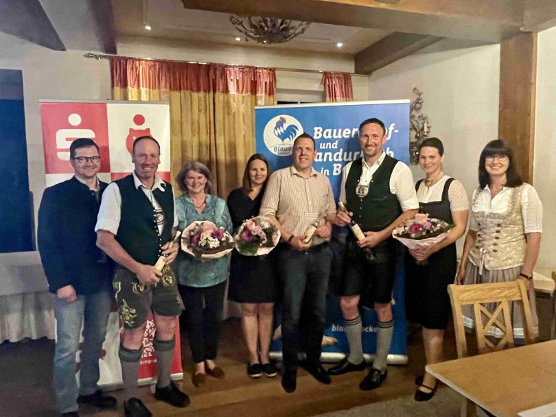Gleich drei Familien und Höfe konnten heuer den „Goldenen Gockel“ vom Landesverband aufgrund bester Kriterienerfüllung in Empfang nehmen. Dazu gratulierten die Vorsitzenden Bauer und Fischer mit Blumen und Schnapserl  den Familien Schnell vom Loisenhhof aus Lienzing, Thaurer vom Marchlhof aus Spöck und Ablinger aus Bernau.
