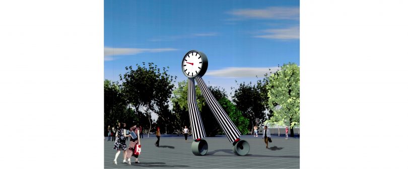 Das Kunstobjekt stellt eine Bahnhofsuhr auf langen, schwarz-weiß gestreiften Beinen dar, die auf breiten Skater-Rollen in Richtung Innenstadt losfährt. Die sechs Meter hohe Skulptur soll die Bewegung als charakteristisches Merkmal des Standortes versinnbildlichen.