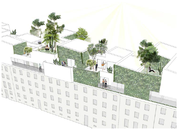 „Level Up“ steht für eine modulare, flexible Aufstockung in Holz-Leichtbauweise, adaptierbar auf nahezu alle 50er bis 70er Jahre Bauwerke. Grundlegend für den Entwurf sind eine modulare Bauweise und ein flexibler Grundriss, der sich sowohl an die unterschiedlichen Bedürfnisse der Bewohner als auch des Bestandsgebäudes anpassen lässt. Vorgefertigte Module (Küche, Bad, Treppenkern) in standardisierten Größen verhelfen zu einem einfachen Transport und schnellen Ab- und Aufbauzeiten. Eine variable Nutzung innerhalb der Module ermöglicht durch das flexible Zuschalten von Räumlichkeiten und Gemeinschaftsflächen wie Dachgärten, Loggia, Co-Working Areale, unterschiedlichste Grundrisstypen zu realisieren. Dank gemeinschaftlicher Nutzflächen auf dem Dach inkl. Aufzügen wird ein Mehrwert für die Bewohner im Bestand geschafft.