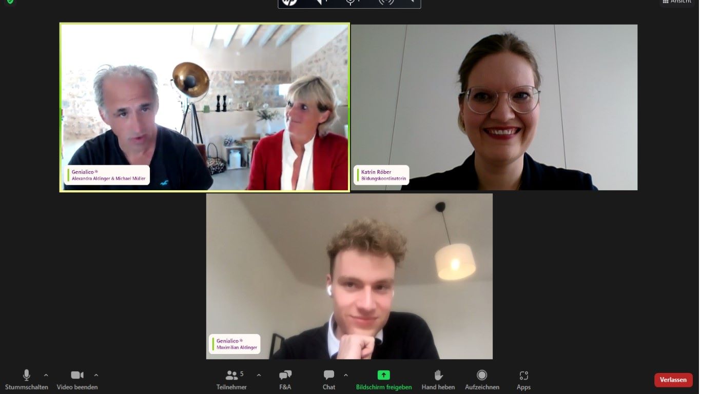 Alexandra Aldinger, Michael Müller und Maximilian Aldinger, Gründerinnen und Gründer von „Genialico“ und Experten für nachhaltigen Lernerfolg haben in der Online-Veranstaltung “Lernerfolg ist so einfach – so gelingt gehirn- und typgerechtes Lernen und Lehren” wesentliche Punkte für ein gelingendes Lehren und Lernen klargestellt. Maßgeblich sei laut Michael Müller, die einflussnehmenden Lernerfolgs-Faktoren zu kennen und im Blick zu behalten. „Dies sind unter anderem die Funktionsweise unseres Gedächtnisses, Lernstrategien, Lerntypen, die Ressourcen, Motivation sowie Ziele“, ergänzt Maximilian Aldinger. Die Motivation der teilnehmenden Dozentinnen und Dozenten an der Veranstaltung war ebenfalls klar: Freude am Lernen stärken, verschiedene Lerntypen kennenlernen sowie der abnehmenden Konzentration von Teilnehmerinnen und Teilnehmern in den Abendstunden begegnen. Das sind nur einige der Rückmeldungen.