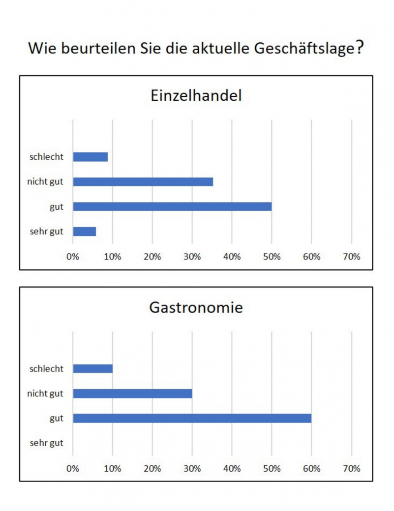 Das City-Management Rosenheim hat im Sommer unter seinen Mitgliedern eine Befragung durchgeführt, um eine Einschätzung des Stimmungsbildes nach dem Corona-Shutdown zu erheben. Die Ergebnisse bestätigen, dass die Mehrheit der Betriebe dank alternativer Absatzwege und der angebotenen Unterstützungsangebote den Shutdown verhältnismäßig glimpflich überstanden haben. Obwohl ein Großteil der Betriebe teils erhebliche Umsatzeinbußen im Vergleich zum Vorjahr erlitt, wurde die aktuelle Geschäftslage branchenunabhängig unter den gegebenen Umständen von 56% der Teilnehmer als gut eingeschätzt.