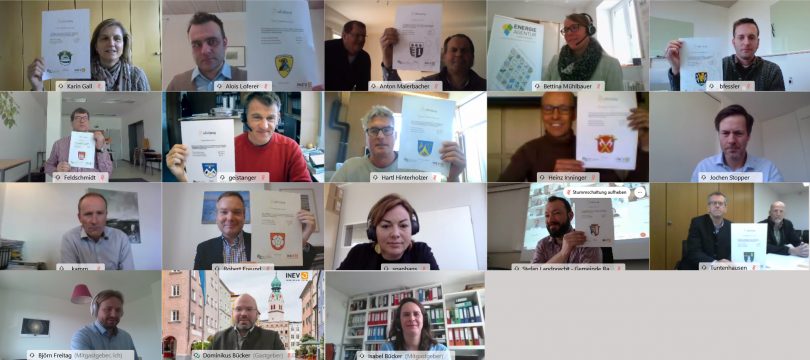 Bericht und Foto: Kommunales Energieeffizienz-Netzwerk Rosenheim-Traunstein – Stolz halten die Vertreter der teilnehmenden Kommunen die Urkunden über ihre Netzwerkziele in die Webcams. Das Ende des ersten Netzwerkjahres ist der Startschuss zur Umsetzung der identifizierten Maßnahmen.Viel Arbeit liegt hinter ihnen, aber nun ist ein wichtiger Meilenstein erreicht. Die dreizehn Kommunen des Energieeffizienznetzwerks Rosenheim-Traunstein setzen sich zum Abschluss des ersten Jahres Ziele für die weitere Netzwerkarbeit.