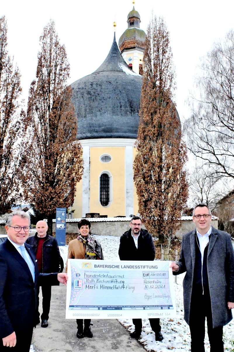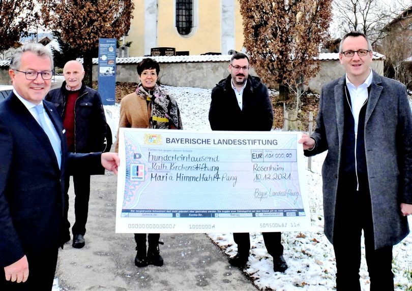 Die Bayerische Landesstiftung mit Sitz in München, deren kultureller Schwerpunkt in der Förderung von Baumaßnahmen zur Instandsetzung von bedeutenden Baudenkmälern liegt, fördert nun die Renovierung mit 101.000 Euro. Überbringer der überraschenden Botschaft war MdL Klaus Stöttner (links), Landtagsabgeordneter in Rosenheim-Ost, der symbolisch den Scheck an den hocherfreuten Domkapitular Dekan Daniel Reichel, Pfarrer der Stadtteilkirche-Am Wasen und der Pfarrverbände Bad Endorf und Westliches Chiemseeufer, überreichte und zugleich noch eine weitere Spende des Bezirks Oberbayern in Aussicht stellte.