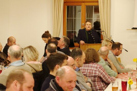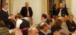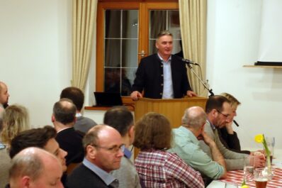 Sepp Andres, Kreisvorsitzender beim BBV freute sich ob des starken Besuchs, stellte sich und die Aufgaben des Verbandes vor und gab folgende aktuelle Vorgehensweise seitens der Vertretung vom Bauernstand bekannt: „In Rosenheim waren wir eine der Ersten, die reagierten als die Politik entschied, bisherige Agrar-Diesel-Rückerstattungen allmählich aufzuheben. Der Bürokratismus tat das Seinige und so gab es inzwischen in Bayern über eintausend Bauern-Demonstrationen, denen sich weitere mittelständische Organisationen angeschlossen haben“. Jetzt aber – so Andres weiter – soll bis zur Bundesrats-Entscheidung am 22. März eine gegenüber der Gesellschaft mildere Form der Problemlösung gesucht werden, dazu erklärte er: „Momentan laufen viele persönliche Verhandlungen auf verschiedenen Ebenen, diese sollen die politischen Entscheidungsträger überzeugen, deswegen wollen wir jetzt von unserer Seite die Bevölkerung weniger behindern, denn wir wissen, dass die Bevölkerung hinter uns Bauern steht“. In seinen weiteren Ausführungen informierte Sepp Andres, der in Rimsting zur Lehre ging und der als Bauhelfer für den Fahrsilobau die Rosenheimer Region, ihre Orte und Bauern sehr gut kennt, über neue Personalien, Strukturen und Aufgaben innerhalb der bäuerlichen Organisationen. Ein besonderes Augenmerk richtete er auf den Zukunftsvertrag, der vom Bayerischen Bauernverband initiiert wurde und der unter anderem den Schutz des Eigentums, den Tierschutz, das Wassermanagement, die Bildung und den Bürokratieabbau betrifft. „Dass mit der Bayerischen Staatsregierung der Zukunftsvertrag ausgemacht wurde, ist das Eine, die Umsetzung dessen ist jetzt unsere Aufgabe – ganz im Sinne eines Mehrwertes für die Gesellschaft“ – so Sepp Andres, der über den BBV-Rosenheim hinaus weitere Ehrenämter in landwirtschaftlichen Gremien ausfüllt. In deren Funktionen sprach er unter anderem folgende Themen an: Anbinde- und Kombihaltung, neues Tierschutzgesetz und Tierärztemangel, 4-Prozent-Flächenstillegung, neue Düngevorordnung und neues Waldgesetz, Pflanzenschutz, verschiedene EU-Richtlinien oder Versicherungsfragen. „Wenn wir all die Punkte und Probleme im gesamten und auf einmal sozusagen als Blumenstrauß der Politik vortragen, dann kommen die Blumen in eine Vase, deswegen nehmen wir uns einzelne Themen vor und bereiten diese gründlich vor“. Seine besondere Empfehlung galt noch der neuen Internetseite des Kreisverbandes Rosenheim www.bayerischerbauernverband/Kreisverband/Rosenheim.