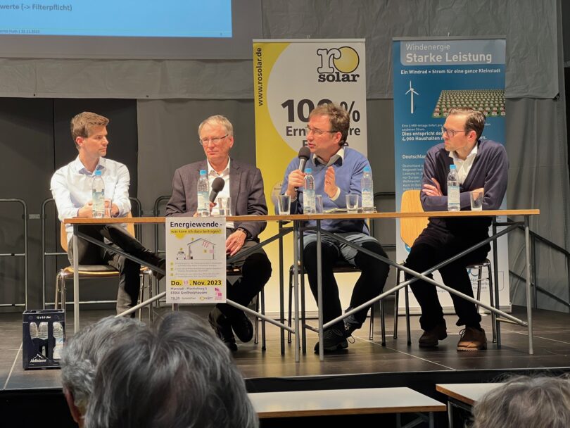 Bericht: LRA Rosenheim – Ist Heizen mit Holz eine saubere Sache? Antworten gab die Podiumsdiskussion der Experten (v.l.n.r.): Patrick Huth (Deutsche Umwelthilfe Berlin), Dr. Georg Kasberger (AELF Rosenheim), Dr. Ralf Straußberger (BUND Naturschutz Nürnberg), Prof. Frank Buttinger (TH Rosenheim). Foto: Rosenheimer Solarförderverein (Rosolar).