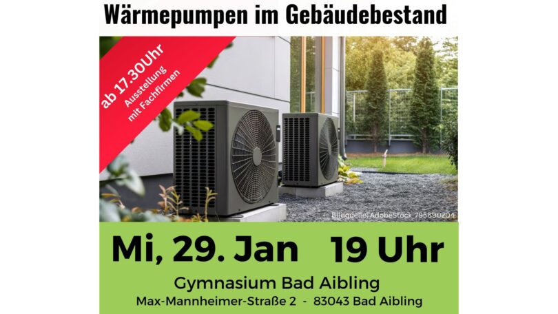 Unter dem Titel „Wärmepumpen im Gebäudebestand“ findet die nächste Info-Veranstaltung der Initiative „Rosenheimer Energiedialoge“ am Mittwoch, 29.01.2025 im Gymnasium Bad Aibling (Max-Mannheimer-Straße 2) statt. Die Veranstaltung beginnt um 17:30 Uhr mit einer Ausstellung, bei der Fachfirmen ihre Auswahl und Lösungen für Planung, Installation und Betrieb von Wärmepumpen präsentieren. Anschließend beginnen die Vorträge um 19 Uhr. Alle interessierten Bürgerinnen und Bürger sind eingeladen, der Eintritt ist kostenfrei.
