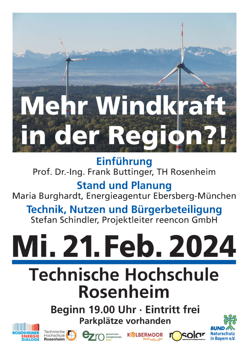 Unter dem Titel „Mehr Windkraft in der Region ?!“ findet die nächste Info-Veranstaltung der Initiative „Rosenheimer Energiedialoge“ am Mittwoch, 21.02.2024 in der Technischen Hochschule (TH) Rosenheim statt. Die Vorträge starten um 19 Uhr im Raum E0.01. Ab 18 Uhr kann man eine Ausstellung im Foyer besichtigen. Alle interessierten Bürgerinnen und Bürger sind eingeladen, der Eintritt ist frei.
