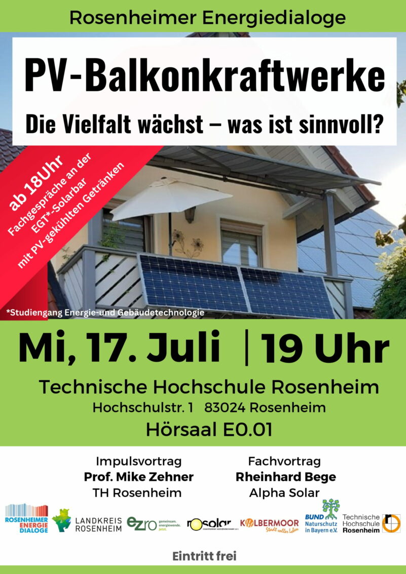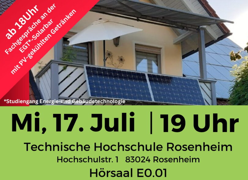 Die Veranstaltung beginnt um 18 Uhr mit einem Get-Together vor dem Gebäude E. Anschließend beginnen die Vorträge um 19 Uhr im Raum E0.01. Alle interessierten Bürgerinnen und Bürger sind eingeladen, der Eintritt ist frei. Prof. Mike Zehner, Experte für nachhaltige Energietechnik der Technischen Hochschule Rosenheim, wird den Abend mit einem Einführungsvortrag zum Thema Photovoltaik und Energiewende eröffnen. Reinhard Bege, Geschäftsführer und Experte der Alpha Solar- und Heizungstechnik GmbH, wird anschließend die verschiedenen Möglichkeiten und Vorteile von PV-Balkonkraftwerken vorstellen.