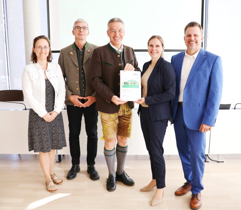Bericht udn Foto: LRA Rosenheim – Übergabe des AOK-Gesundheitsberichts (v.l.n.r.): Katrin Posch, Geschäftsstellenleitung der Gesundheitsregionplus, Gesundheitsamtsleiter Dr. Wolfgang Hierl, Landrat Otto Lederer, Judith Häusl Direktorin AOK Bayern Direktion Rosenheim und ihr Stellvertreter Robert König.