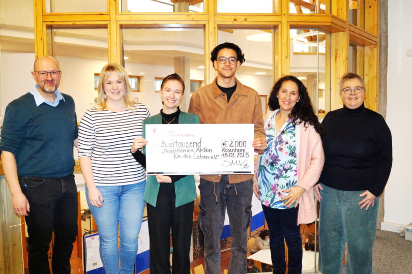 Bericht und Foto: LRA Rosenheim – Bei der Scheckübergabe waren mit dabei (von links): Stellvertretender Schulleiter Christian Melchner, Verbindungslehrerin Franziska Arnold, Tagessprecherin Michelle Schneider, Tagessprecher Ilyass Haqbane, Vorsitzende der Rosenheimer Aktion Christine Domek-Rußwurm und Schulleiterin Christiane Elgass.