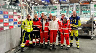Im Sport kann immer etwas passieren – egal ob beim Fußball, Skifahren oder im Eishockey. Zur medizinischen Absicherung ist bei größeren Veranstaltungen ein Sanitätsdienst vorgeschrieben. Die Rettungskräfte sorgen für die Sicherheit von Sportlern und Zuschauern. Angefeuert von tausenden Fans finden in den Wintermonaten dutzende Spiele der Starbulls im Rosenheimer ROFA-Station statt. Dabei steht immer ein Sanitätsdienst mit bis zu fünf Einsatzkräften und mehreren Einsatzfahrzeugen im Hintergrund bereit. Zum ersten Spiel der Starbulls waren die vier Hilfsorganisationen gemeinsam im Einsatz und sorgte für besondere Aufmerksamkeit im Stadion. In der Regel wechseln sich die Organisationen wöchentlich ab. Alle Helfer verfügen über hohes Fachwissen und können so jederzeit qualifizierte Erste-Hilfe-Maßnahmen einleiten oder mögliche Verletzungen versorgen. Dazu stehen Notfallrucksäcke und EKGs immer bereit. Lediglich die Logos auf den Jacken unterscheidet die Helfer voneinander. Dennoch: „Es ist eine tolle und unkomplizierte Zusammenarbeit – egal ob im Einsatz oder bei Übungen“, bestätigt Einsatzleiter Matthias Fischer. Kevin Braun, Malteser Hilfsdienst, Bernd Knoblechner, Johanniter, und Markus Neef, BRK-Bereitschaftsleiter, schließen sich den Worten an. Nicht nur bei den Fans ist das Interesse am Eishockey groß, sondern auch die Einsatzkräfte freuen sich auf die Spiele der Starbulls. Da in den vergangenen zwei Jahren kaum Veranstaltungen in den Stadien der Region möglich waren, ist die Motivation unter den Einsatzkräften groß. Nichtsdestotrotz suchen die vier Organisationen neue Mitglieder, die sich ehrenamtlich im Sanitätsdienst und Katastrophenschutz engagieren.