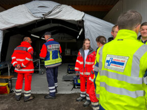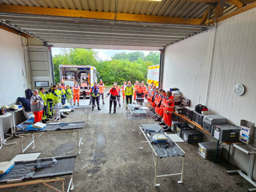 In theoretischen Lerneinheiten thematisieren die Ausbilder bereits bekannte und neue Einsatzpläne für mögliche Großschadenslagen in der Region. Darüber hinaus lernten die Teilnehmenden neue Konzepte aus dem bayerischen Rettungsdienst kennen. Beispielsweise ermöglicht das ISBAR-Schema eine strukturierte Übergabe von Notfallpatienten an andere Besatzungen oder Kliniken. Zur Steigerung der Teamperformance gingen die Ausbilder ebenso auf das Crew-Ressource-Management und seine Einsatzmöglichkeiten im Katastrophenschutz ein. Die Stationen wurden von erfahrenen Führungskräften aus dem Rettungsdienst und Katastrophenschutz begleitet. Dabei kam es zum organisationsübergreifenden Austausch unter den Kräften über die bestehenden Strukturen verbunden mit neuen Ideen. An praktischen Stationen wendeten die Kräfte ihre Konzepte an: Binnen weniger Minuten errichteten sie strukturierte Patientenablagen und Behandlungsplätze, wie sie bei einer plötzlichen Vielzahl an Notfallpatienten nach Unglücksfällen erforderlich sind. Dafür verfügen die Einheiten jeweils ausreichend Material, um 25 oder gar 50 Patienten an einem Behandlungsplatz versorgen zu können.