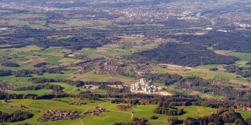 Bericht: LRA Rosenheim – Foto: Rainer Nitzsche – Bildunterschrift: Blick ins Rosenheimer Land mit Zementwerk in Rohrdorf