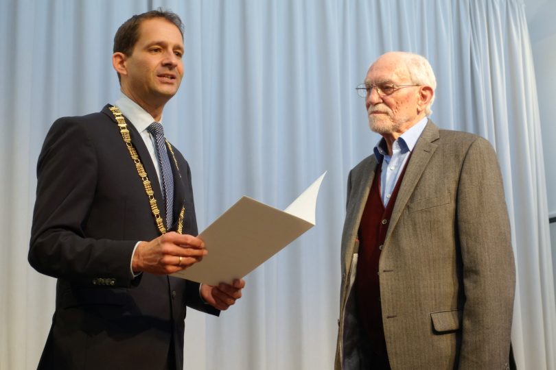 Den eigenen Horizont erweitert haben sicherlich seine vielen Reisen in ferne Länder, vor allem Lateinamerika, Nepal, Tibet oder Israel. Im Alter von 40 Jahren fing er dann als Autodidakt an, sich auch der Kunst zu widmen. Zuerst schuf er Zeichnungen und Radierungen stiller Landschaften – inspiriert dabei von seinen Reisen. Später kamen Prägedruck, Holz- und Linolschnitte und Radierungen hinzu. Sicherlich ein Höhepunkt seines kreativen Werkens war sein Beteiligung an der Neugestaltung der Rosenheimer St. Nikolaus-Kirche mit den zwei großen Schriftwänden vorne im Altarraum. Bei den Arbeiten von Ludwig Gruber spüre man den „Grundklang des Kosmos und des eigenen Herzens“, sagte Hans Krieger in seiner Laudatio. Drei fachliche Gutachten bildeten die Grundlage für die Entscheidung des Rosenheimer Stadtrats, dem 86-jährigen mit dem Kulturpreis der Stadt Rosenheim auszuzeichnen. Robert Berberich, ehemaliger Kulturreferent der Stadt, beschreibt Gruber darin „als Persönlichkeit, die wie kaum eine andere das kulturelle, gesellschaftliche und geistige Klima und Profil der Stadt Rosenheim von den siebziger Jahren an bis in die jüngste Vergangenheit geprägt hat.“ Rosenheims Oberbürgermeister Andreas März überreichte den Preis, der mit 5.000 Euro dotiert ist, an Ludwig Gruber. Dieser thematisierte in seiner Dankesrede auch die aktuelle Weltlage mit Corona-Pandemie, Klimakrise und Krieg.