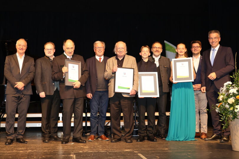 Ein sehr musikalisches Elternhaus steht auch am Anfang der Lebensgeschichte des Kultursonderpreisträgers Sebastian Weyerer. Christoph Maier-Gehring beschrieb ihn als „einen ausgesprochen sympathischen, rüstigen „älteren Herren“, immerhin zählt er 81 Lenze, wach, aufgeschlossen, beredt. Es war eine Freude, mich mit ihm zu unterhalten.“ Anfang der 1950er Jahre schickten ihn seine Eltern zu den Regensburger Domspatzen. Mit Beginn des Stimmbruches kam der junge Sebastian nach Prien. Sein Vater hatte dort eine Stelle als Lehrer und Kirchenmusiker antreten können. Nach dem Abitur studierte er Schulmusik in München. Dem Referendariat in Wasserburg schlossen sich Lehrer-Stationen in Traunreut und Trostberg an. 1979 schließlich kam er zurück nach Prien. Dort wirkte er als Musiklehrer im Ludwig-Thoma-Gymnasium bis zu seinem Ruhestand im Jahr 2006. Der „musikalische Tausendsassa“, wie ihn Priens Bürgermeister Andreas Friedrich bezeichnete, hinterließ aber auch abseits der Schule beeindruckende Spuren. Als ehrenamtlicher Organist war er in Kirchen im östlichen Landkreis Rosenheim tätig. Die Blaskapelle Prien dirigierte er von 1978 bis 1994. Mit ihr gab er weltweit Konzerte, unter anderem in den USA und in China. Besonders stolz ist Sebastian Weyerer auf die Priener Blasmusik, weil sie die erste Kapelle war, die ein ganzes Kirchenkonzert allein bestritt. Zur 850-Jahr-Feier von Prien komponierte er die Festfanfare für die Blaskapelle. Besonders am Herzen liegt dem Kultursonderpreisträger die Chormusik. Über 50 Chorwerke stammen aus seiner Feder. Mit unterschiedlichen Ensembles gab er viele Konzerte in der Region und bis heute übernimmt er mit der Blaskapelle Aschau und dem Müllner-Peter-Chor die musikalische Gestaltung der Ölberg-Wallfahrt in Sachrang. Beim Festakt im Chiemsee-Saal präsentierte sich Sebastian Weyerer als Dirigent des Ludwig-Thoma-Chores. Der gründete sich anlässlich des 50-jährigen Jubiläums des Ludwig-Thoma-Gymnasiums. Für ein zeitgenössisches Werk zum Thema „Menschenrechte“ brauchte Weyerer einen großen Chor. Er kam auf die Idee, den Schulchor mit ehemaligen Schülerinnen und Schüler sowie Lehrerinnen und Lehrern zu verstärken. Und schon war der Ludwig-Thoma-Chor geboren. Mit ihm gibt Sebastian Weyerer nicht nur in der Region Konzerte, es gab auch Konzertreisen nach Ungarn, Slowenien und Italien. Weyerers Lieblingsinstrument ist und bleibt die Orgel. Ein kleines Exemplar steht bei ihm zu Hause im Musikzimmer. Bis heute ist er musikalisch noch unglaublich aktiv. Christoph Maier-Gehring verriet er, dass er noch viel vorhabe, wenn das Leben es wolle.