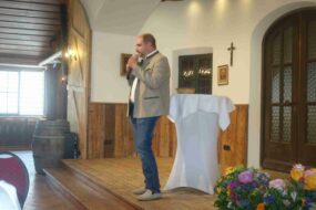 Seit dem letzten Landfrauentag und mit inzwischen erfolgreichen Neuwahlen im Landkreis und in den Ortsverbänden hat sich viel getan. Kreisbäuerin Katharina Kern ging in ihrem Bericht auf die Belastbarkeit der Frauen in vielen Bereichen ein und sie dankte dem Kreisobmann Sepp Andres, dass im Rosenheimer Land Männer und Frauen auf Augenhöhe zusammenarbeiten, wenn es um Themen rund um die Landwirtschaft geht. Weiters sagte sie: „Unsere ständige Aufgabe ist es, auf gesellschaftliche Defizite zu reagieren. Deswegen bedanke ich mich ganz besonders bei unseren Landfrauen Maria Baumgartner, Maria Fischbacher und Maria Riepertinger, dass sie sich zum Thema Alltags-Kompetenz viel mit den Schulen betätigen. Dies kann ein wichtiger Schritt sein in Richtung zukünftiges Schulfach im Lehrplan sein“. Dieser Wunsch ging in Richtung Politik, dessen Vertreter an diesem Tag Rosenheims Zweiter Bürgermeister Daniel Artmann war. Auch namens von Oberbürgermeister Andreas März und Landrat Otto Lederer sowie namens von anwesenden stellvertretenden Landrat Sepp Hofer und Bezirksrat Sebastian Friesinger bezeichnete Artmann die Landfrauen als Managerinnen und Unternehmerinnen. „Was wäre unser schönes Chiemsee-Alpenland, wenn nicht von Euch so viel geleistet werden würde, das verdient und fordert von uns mehr Anerkennung“. Kreisobmann Sepp Andres würdige seinerseits die gute Zusammenarbeit mit den Landfrauen und brachte seine Anerkennung in Form von Blumensträußen für die Kreisbäuerinnen Katharina Kern und Maria Fischbacher zum Ausdruck. Auch Bürgermeister Daniel Wendrock von der Gemeinde Rott am Inn stellte die Bedeutung der Frauen in der eintausendjährigen Kloster-, Kultur- und Landschaftspflege-Geschichte in seinem Grußwort heraus.
