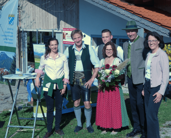 Bild 1: v.l.n.r: Monika Schaecke, Abteilungsleitung AELF, Andreas, Martha und Johannes Hirzinger, Sepp Grandl, VLF, und Behördenleiterin Anna Bruckmeier