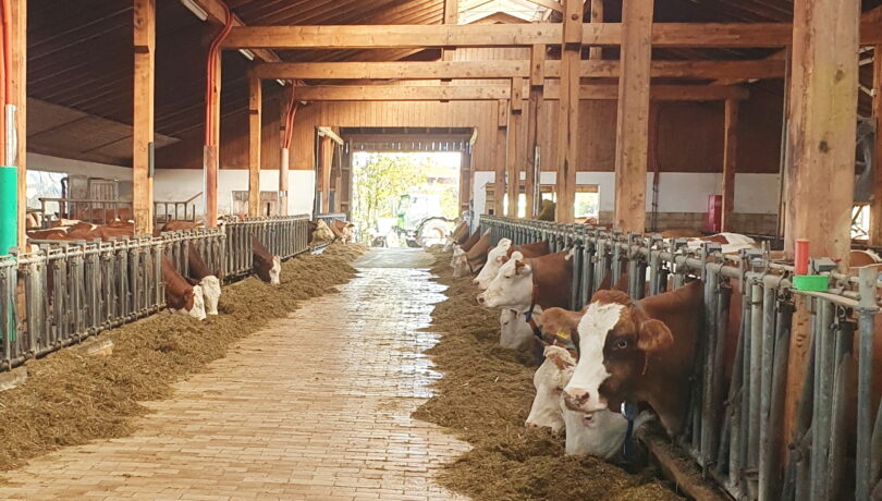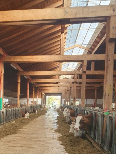 Im Januar 2023 folgte der aktuelle Umbau. Zusätzlich wurde im Stallgebäude durch einen Anbau Platz für die Kälber geschaffen. Im laufenden Betrieb wurde auf Melkroboter umgestellt. Johannes Hirzinger, Betriebsnachfolger und Meister, zeigte beim Rundgang durch den Stall anschaulich, wie auch Bestandsgebäude umgenutzt und erweitert werden können, um die Ansprüche an moderne Arbeitswirtschaft zu ermöglichen. Der Melkroboter steht nun an der Stelle, wo vorher der Melkstand war.