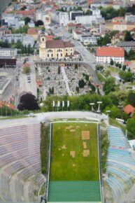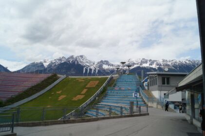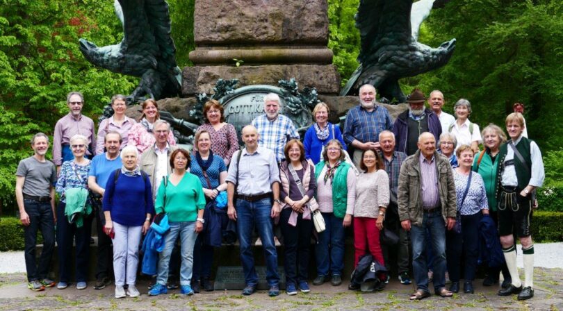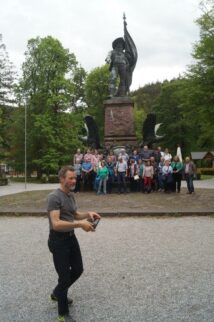 Nach zwei intensiven, hochinteressanten „Lehrstunden“ über die Glockengießerei ging es zum Bergisel und gut 40 m hinauf auf den Schanzenturm. Wer schon einmal die Übertragung der Vier-Schanzen-Tournee gesehen hat, kennt den Blick vom Bakken über den Anlauf hinunter nach Innsbruck, bei dem man meint, die Skispringer würden mitten in der Altstadt landen. Viel fehlt dazu auch nicht. Noch ein Stockwerk höher als der Bakken liegt die große Panorama-Terrasse, von der aus sich rundum ein schöner Ausblick bot – hinüber zum Patscherkofel sowie die Nordkette des Karwendels und das Wipptal hinauf Richtung Brenner. Weil die Bergisel-Schanze mit Matten belegt ist, kann sie auch im Sommer benutzt werden und so konnten die Besucher gerade noch einen Springer bei seinem letzten Trainingssprung für diesen Tag beobachten. Bergisel – der Name steht aber auch für ein dunkles Kapitel der bayrisch-tiroler Beziehungen, die Tiroler Freiheitskämpfe unter der Führung von Andreas Hofer, die 1809 zu den vier Schlachten am Bergisel führten. Glücklicherweise sind diese kriegerischen Zeiten längst Geschichte und so konnte sich die Gruppe vor der Heimreise noch am Andreas-Hofer-Denkmal zu einem Erinnerungsfoto zusammenstellen.
