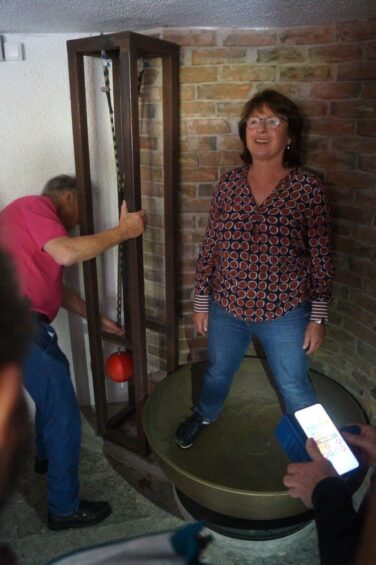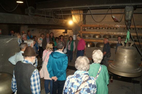Bei der Führung kam die Gruppe auch zu einem alten, gut zwei Stockwerke hohen Klöppel und erfuhr von dessen Herkunft. Mit ihm wurde früher Österreichs größte Glocke, die „Pummerin“ in Wien, geläutet. Als der Klang der Glocke nicht mehr zufriedenstellend war, erhielten die Grassmayrs den Auftrag für einen neuen Klöppel, der nach gründlichen Analysen und umfangreichen Berechnungen maßgeschmiedet wurde. Sowohl die Pfarrei wie auch die Diözese waren vom neuen Klang so angetan, dass sie den alten Klöppel zum Dank den Grassmayrs stifteten, wo er ein eindrucksvoller Teil des Museums ist. Neben den Glocken werden beim Grassmayr auch Klangschalen hergestellt. Sie finden als Musikinstrumente Verwendung, in historischen Uhren sowie in Rathäusern und anderen weltlichen Bauten schlagen sie die Stunden und im medizinischen Bereich entfalten sie ihre harmonisierende, beruhigende und entspannende Wirkung selbst in Bereichen des menschlichen Körpers, in denen man das nicht vermutet. Davon konnten sich die Besucher selbst überzeugen, als sie sich unter eine große Klangschale stellten, die sich wie ein großer Schirm über sie wölbte, und den tiefen, warmen Schlagton auf sich wirken ließen.