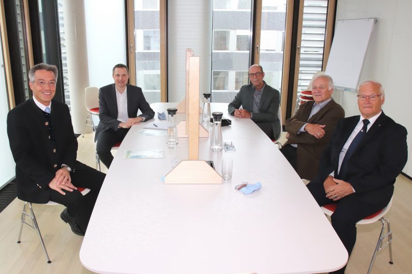 „Man hat im Laufe des Lebens viel geschenkt bekommen und möchte deshalb etwas zurückgeben und sich dankbar zeigen“, sagte Professor Dr. Peter Zaiss vom Vorstand der Aktiven Wirtschaftssenioren e.V. im Gespräch mit Landrat Otto Lederer und Peter Heßner von der Wirtschaftsförderstelle im Landratsamt Rosenheim. Der Landrat betonte die enorme Wichtigkeit des Beratungsangebotes der Aktiven Wirtschaftssenioren für Firmengründer und Unternehmer. Die langjährige sehr gute Zusammenarbeit von Landratsamt und Wirtschaftssenioren wird weitergeführt. Die Wirtschaftsförderstelle organisiert einmal im Monat einen Beratungstag mit den Aktiven Wirtschaftssenioren. Darüber hinaus unterstützen sie Projekte der Wirtschaftsförderung, beispielsweise in der Jury zum Rosenheimer Gründerpreis. Von links: Landrat Otto Lederer, Peter Heßner, Harald Wachholz (Kassier), Bernd Remmelberger (1. Vorstand) und Professor Dr. Peter Zaiss (2. Vorstand).
