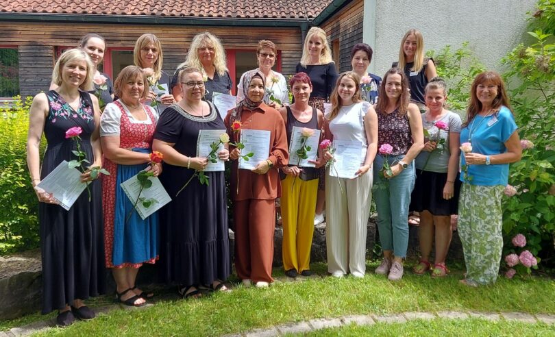Zum Foto: Blumen gab’s für die qualifizierten Tagespflegepersonen. Sie freuen sich mit der Kursleitung und den Fachberaterinnen über den erfolgreichen Abschluss