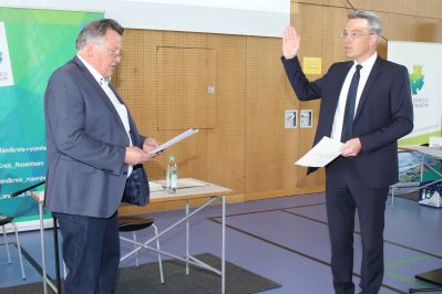 Vereidigung, Wahl der stellvertretenden Landräte und die Besetzung der Ausschüsse – es waren eine ganze Reihe Formalien, die der neugewählte Rosenheimer Kreistag heute (13.05.20) in seiner konstituierenden Sitzung abarbeiten musste. Das älteste Mitglied des Kreistages, Josef Baumann von den Freien Wählern, nahm Landrat Otto Lederer zu Beginn der Sitzung den Amtseid ab. Um den coronabedingten Abstand einhalten zu können, trafen sich die Kreisrätinnen und Kreisräte nicht im großen Sitzungssaal des Landratsamtes, sondern in der Sporthalle des Gymnasiums in Bruckmühl.