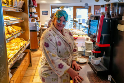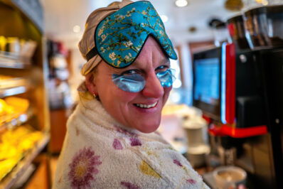 Am Rosenmontag gilt am Samerberg eine einfache Regel: Wer geschniegelt zur Bäckerei kommt, ist selber schuld. Denn beim Samerberger Dorfbäcker wurde heute nicht nur verkauft – es wurde inszeniert. Zwischen Brotregalen und Kaffeeduft stand Verena Grad geschniegelt wie frisch aus der „Spa-Schicht“: im geblümten Bademantel, mit Schlafmaske auf der Stirn und kühlenden Augenpads.