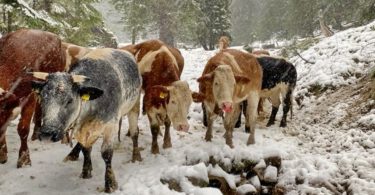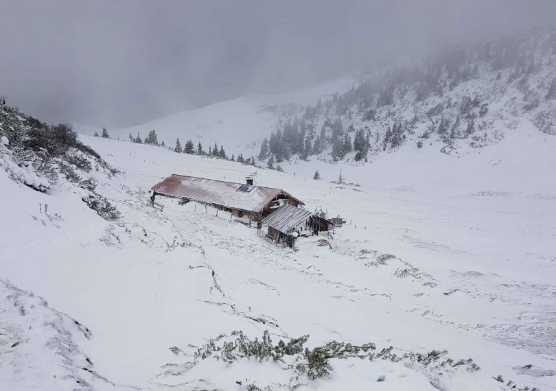 Tiefster Winter ist überraschend auf der 1.692 Meter hoch gelegenen Rossalm eingekehrt. Die höchst gelegene Alm im Chiemgau zwischen Weitlahnerkopf und Geigelstein im Naturschutzgebiet Geigelstein hat gewöhnlich bis Ende September (rund um Michaelitag, der am 29. September ist) Viehbetrieb. Am Wochenende wäre der Viehabtrieb geplant gewesen. Doch die verantwortlichen Alm- und Bauersleute mussten sich aufgrund von 50 cm Neuschnee, Schneesturm und kaum Sicht für Treiber und Tiere entscheiden, die 36 Stück Vieh in den Alm-Stallungen zu lassen. Nun ist der Abtrieb für das nächste Wochenende vorgesehen.