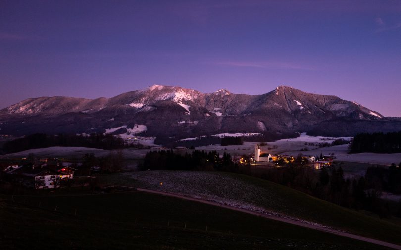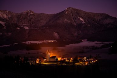 In besonderer Stimmung zeigt sich dieser Wintertage der Samerberger Ortsteil Rossholzen mit seiner ortsbildprägenden Kirche “St. Bartholomäus”. Wie weihnachtlich beleuchtet präsentiert sich das Dorf mit Kirche, Moarhof und Altenheim mit den dahinter liegenden Bergen und gibt so einen passenden Charakter zu den Festtagen während des Jahreswechsels.