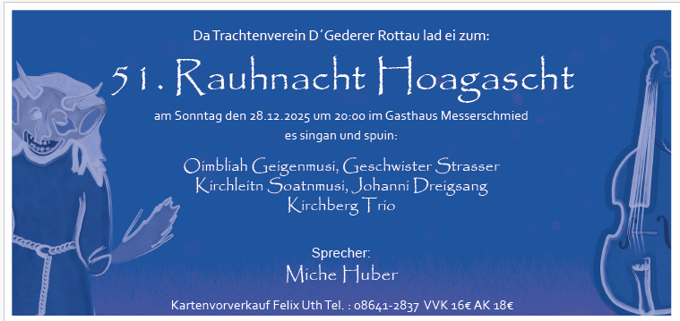 Der Trachtenverein “D’Gederer” Rottau lädt am Sonntag, 28. Dezember 2025, um 20 Uhr zum 51. Rauhnacht-Hoagascht ins Gasthaus Messerschmied ein.