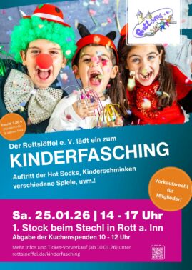 Der Förderverein Rottslöffel e.V. lädt am ‚Sonntag, den 25.Januar 2026 wieder zum Kinderfasching nach Rott am Inn ein. Im Festsaal des Landgasthofs Stechl erwartet Kinder, Eltern und Großeltern ein bunter und familienfreundlicher Faschingsnachmittag.