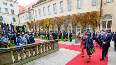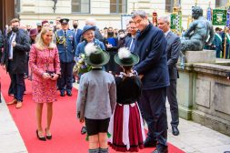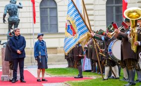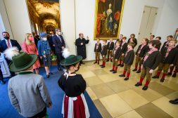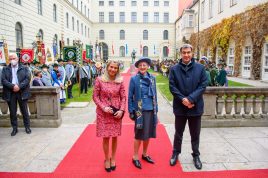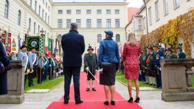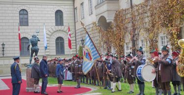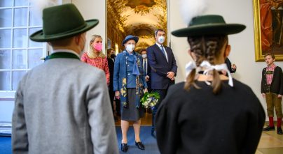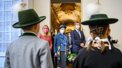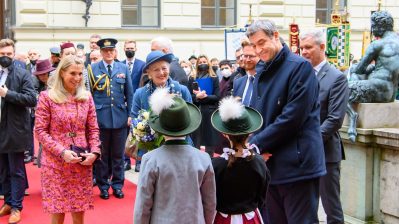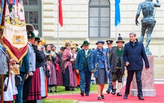 Zu den farbigsten und fröhlichsten Ereignissen in der vergangenen Woche gehörte in Bayern der Staatsbesuch von Königin Margarethe II aus Dänemark in München. Im Innenhof der Münchner Residenz erwiesen unter anderem Abordnungen vom Bund der Bayerischen Gebirgsschützen und des Bayerischen Trachtenverbandes dem Ehrengast die Aufwartung. Von dieser besonderen Begegnung diese Bilder, mit dabei auch Aufnahmen von der Übergabe eines weiß-blauen Blumenstraußes durch die Kinder Antonia Gratz (9) und Leon Lang (11) vom Trachtenverein “Enzian” Töging (Gauverband I).