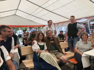 Höglmüller mit seiner Frau Waldtraud auf dem “Abschiedsgeschenk” der Belegschaft und der Gäste beim Probesitzen auf der neuen Hausbank