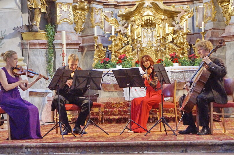 Veranstalter des Konzerts am 25. Juni um 17 Uhr auf dem Kirchenhügel ist die Kulturinitiative Ruhpolding. Das Salzburg Ensemble mit Daniela und Florian Beer, Violinen, Romana Rauscher, Viola und Simon Nagl, Violoncello spielen „Arrival of the Queen of Sheba“ von Georg Friedrich Händel, Divertimento D-Dur Hob. II:22 von Joseph Haydn und das Streichquartett in a-Moll op. 51,2 von Johannes Brahms. Dieses Quartett ist sicherlich der Höhepunkt im Programm, denn die Komposition ist nicht nur das Ergebnis eines langen Ringens des Komponisten mit der Form des Streichquartetts. Es verlangt auch von den Interpreten eine kenntnisreiche Interpretation, um die Gegensätze in der musikalischen Aussage hörbar zu machen – mit neobarocken Anklängen und einer Entwicklung des variationsreichen Motivmaterials aus wenigen Tönen.