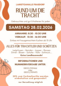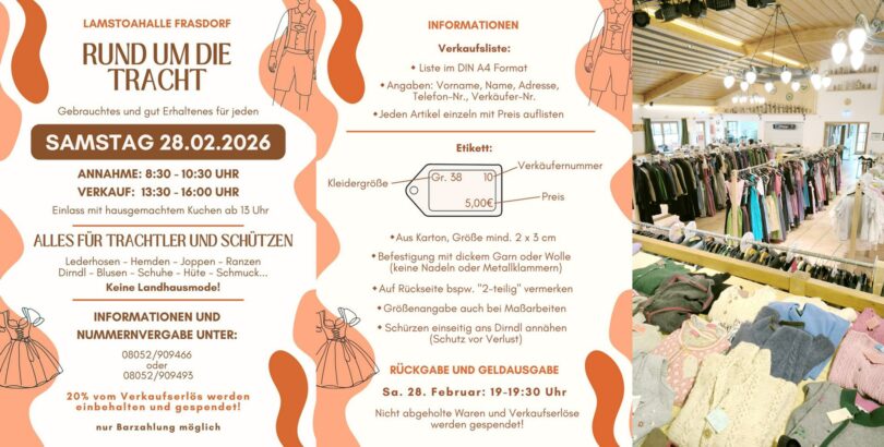 Am Samstag, 28. Februar 2026, findet in der Lamstoahalle Frasdorf wieder der Trachtenmarkt „Rund um die Tracht“ statt.