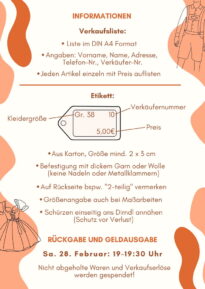 Die Rückgabe nicht verkaufter Ware und die Geldausgabe erfolgt am 28.02. zwischen 19 Uhr und 19:30 Uhr. Nicht wieder abgeholte Waren und Verkaufserlöse werden gespendet. Ein besonderer Aspekt des Markts ist der soziale Gedanke: 20 Prozent des Verkaufserlöses werden einbehalten und gespendet.